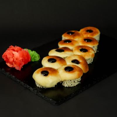 Ryż, nori, łosoś lekko słony, Philadelphia, serek Parmezan, sos Teriyaki, sezam