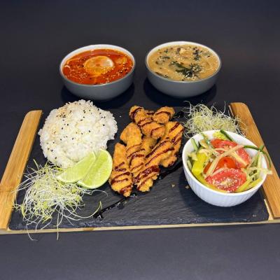 Zupa, ryż, łosoś, salatka