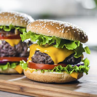 Wołowina 100% / cheddar / sos BBQ / sałata / pomidor / konfitura z czerwonej cebuli / ogórek kiszony