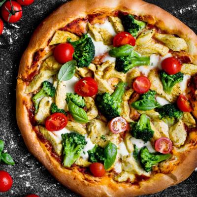 Sos pomidorowy / ser mozarella / pieczarki / cukinia / brokuł / szpinak / świeże pomidorki koktajlowe